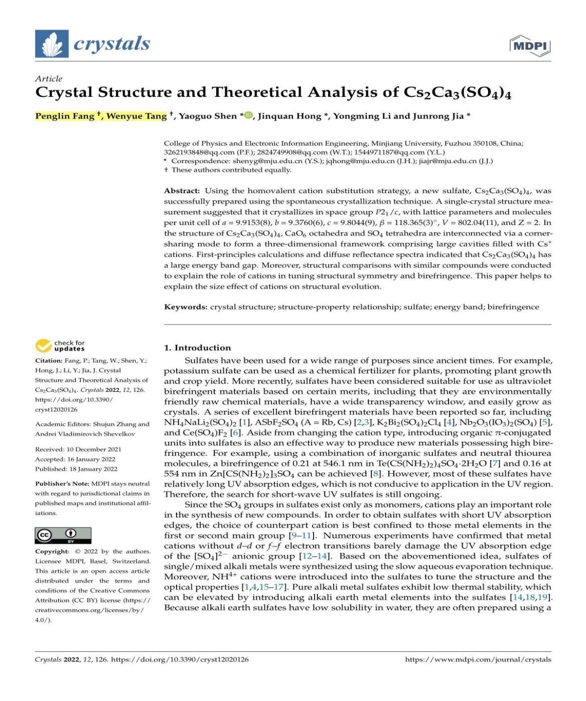 2022年1月18日,bwin必赢2019级电子科学与技术本科生房鹏林以及2020级电子科学与技术汤文悦等同学在期刊 Crystals正式上线发表论文题目为《Crystal Structure and Theoretical Analysis of Cs2Ca3(SO4)4》的论文一篇,可喜可贺,也展现了公司学子积极向上的探索精神和优秀的科研能力。